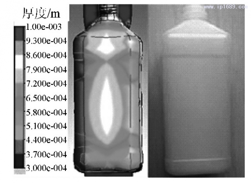 通過正交實驗結果得出了最優工藝參數,經過13段非等厚度理想型坯吹脹成型,壁厚方差為1. 94×10-4m2,小于正交試驗的最小方差3.52762×10-4m2,壁厚均勻性顯著提高,壁厚平均值為0.773 mm,最低厚度為0.556 mm,厚度合格。最終優化模型與產品如圖 12 所示。
