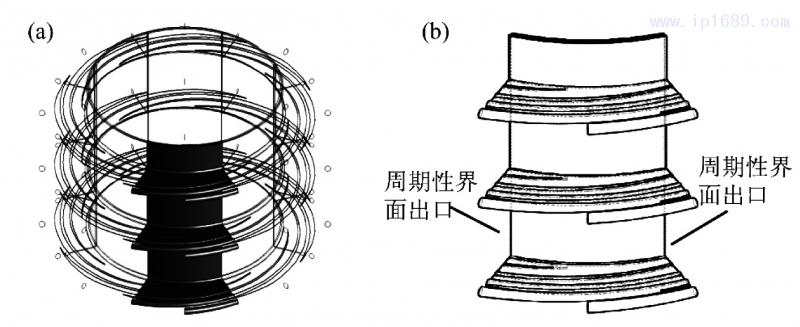 圖1、2分別為三層共擠吹塑薄膜平面疊加螺旋機頭流道幾何模型及螺旋分配系統主要結構。文章采用的機頭使用兩臺或三臺擠出機生產ABA型三層共擠吹塑薄膜,物料組合結構形式為LDPE/HDPE/LDPE。模型具有周期對稱的特點,為了減小計算規模,提高計算精度,文章使用周期性邊界對1/8的流道進行模擬,周期性邊界入口所在平面為XY平面繞Y軸旋轉-22.5°后形成的面,周期性出口所在平面為XY平面繞Y軸旋轉-67.5°后形成的面。