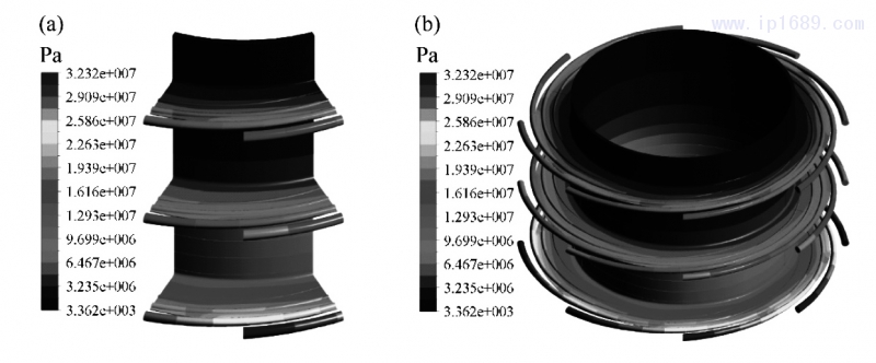 (a)計算域的壓力分布云圖 (b)整個流道的壓力分布云圖