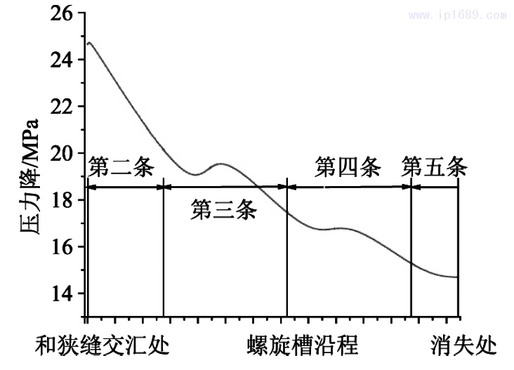 第一層層分配流道的壓力等壓線如圖4所示。在第一條螺旋槽和第二條螺旋槽前段部分,等壓線垂直于螺旋槽軸線;在狹縫中,等壓線是以Y軸為中心的帶有“Z”形彎折的一簇類同心圓,“Z”形彎折均發生在螺旋槽區域中,彎折點位于螺旋槽和狹縫的相貫線附近。在螺旋槽和狹縫交匯處,等壓線開始變成類同心圓形狀,且該處等壓線十分密集,壓力梯度較大;沿狹縫流動方向,壓力梯度越來越小。圖5為各條螺旋槽出口在層分配流道對稱平面上的壓力降,這是模型周期對稱后一條完整螺旋槽的出口在層分配流道對稱平面上的壓力降。從圖5中可以看出,螺旋槽沿程,壓力梯度整體上不斷減小,在第五條螺旋槽末尾段趨于零,在螺旋槽與狹縫交匯處所對應的角度上,壓力出現一小段局部的升高。