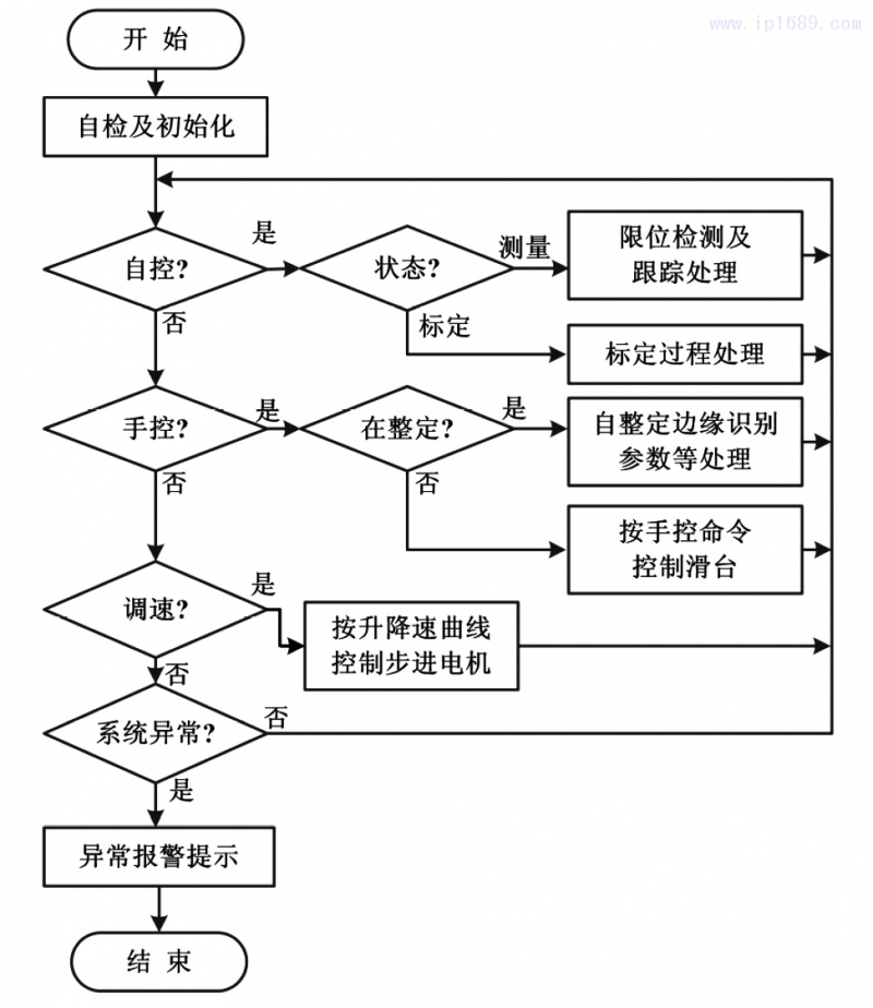 跟隨模塊選用STM8 微處理器為控制器,處理薄膜邊緣信號檢測、控制驅動X射線測量頭跟隨薄膜移動、與測厚程序同步工作、顯示當前工作狀態信息等,可對薄膜檢測頭進行標定,并可手動操控滑臺移動。跟隨控制程序流程如圖5所示。