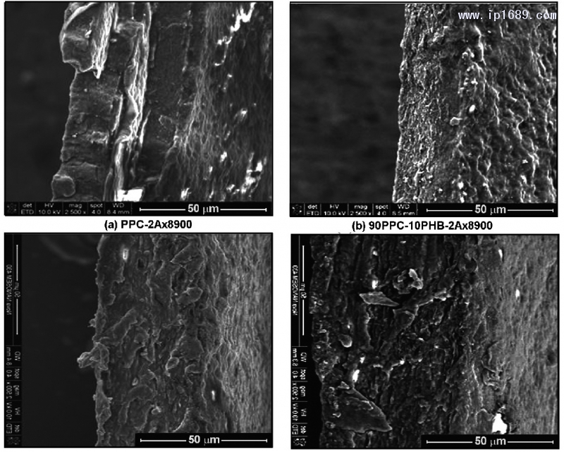 圖1(a)顯示的是未添加PHB的PPC-2AX900薄膜樣品微觀形貌,可看出斷裂時表面較不平整,粗糙且有裂紋產生,表現為韌性斷裂。隨著PHB含量的進一步增加,薄膜斷面更為平整(見圖11(b)、(c)和(d)),表明PHB的加入使復合薄膜的韌性有一定程度的下降,且隨著PHB含量的增大下降幅度越大。從圖11(b)觀察到,作為分散相的PHB由于受到縱向牽引力作用被拉薄呈片層狀均勻分布在PPC連續相中,相界面開始演變得更模糊,表明PHB在PPC基體中能良好分散,相容性較好。類似地,在圖11(c)和(d)中沒有出現明顯的相分離,表明此質量比下ppc和PHB仍具有較好的相容性。
