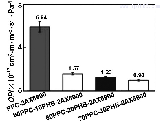 隨著PHB含量的增大,復合膜的氧氣滲透系數逐漸降低,其中70PPC-30PHB-2AX8900的OP值達到9.8X10-114cm3·m/(m2·s·Pa),與未加入PHB的PPC-2AX900相比,氧氣阻隔性能提升了約5倍。對比純PHB的氧氣滲透系數(6.93X10-114cm3·m/(m2·s·Pa)),僅加入30%(質量分數)的PHB,薄膜的氧氣阻隔性能與純PHB的阻隔性能達到一個數量級。這表明除了PHB本身氧氣滲透系數低,采用AX900增容的PPC和PHB共混物吹塑成薄膜后,分子鏈發生取向,分子排列更加有序,能有效地阻擋氧氣分子的擴散,延長了氣體滲透路徑,從而使復合膜的氧氣阻隔性能得到較大幅度的提升[11]。
