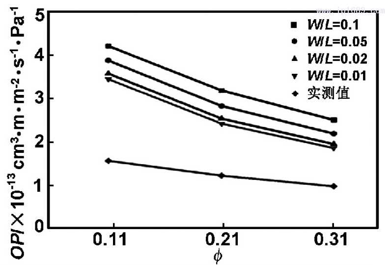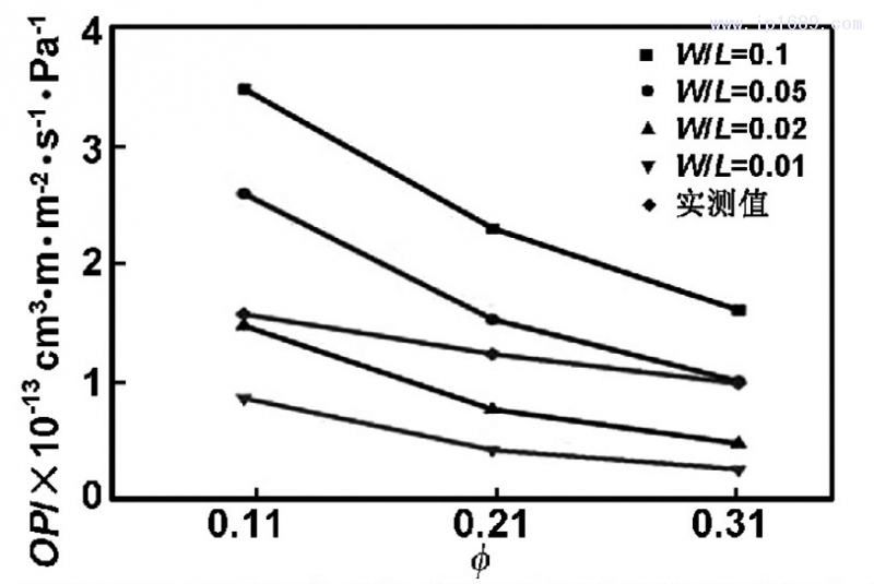 其中,Pc、PM、Pd分別是混合物的氣體滲透系數、連續相氣體滲透系數以及分散相氣體滲透系數;φd為共混材料中分散相體積分數;W為分散相平行于滲透方向的尺寸;L為分散相垂直于滲透方向的尺寸。