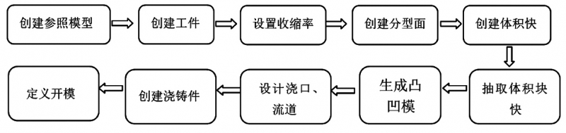 完成產品建模后利用CREO軟件進行分模設計。分模時使用了CREO制造模塊下的模具型腔子模塊,流程如圖3所示所示。考慮到該塑件形狀復雜,模具整體外形尺寸的大小關系,模具零件加工的難易程度,現決定選用一模一腔的模具結構形式。分型面選在模型的上表面,這樣最主要的成型區域都留在動模板上,方便加工,如圖4所示。