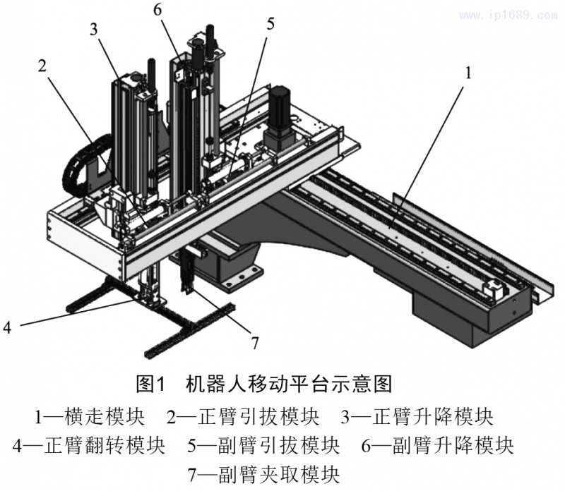 本文所設(shè)計(jì)的橫走式雙臂單截機(jī)械手結(jié)構(gòu)如圖1所示,機(jī) 械手共分為7個模塊,分別為橫走模塊、正臂引拔模塊、正臂升 降模塊、正臂翻轉(zhuǎn)模塊、副臂引拔模塊、副臂升降模塊、副臂夾 取模塊。