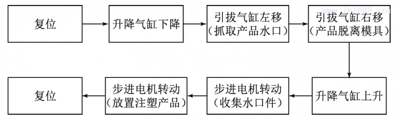 橫走式雙臂單截機(jī)械手復(fù)位,正臂翻轉(zhuǎn)模塊與副臂夾取 模塊都在臥式注塑機(jī)的上后方,正臂翻轉(zhuǎn)模塊呈垂直姿態(tài),副 臂夾取模塊呈張開姿態(tài)。當(dāng)臥式注塑機(jī)完成注塑后打開防護(hù) 門,并向可編程控制器發(fā)送信號,可編程控制器向兩升降氣缸 的電磁閥發(fā)送開關(guān)量信號, 電磁閥的閥芯改變氣路方向,升降氣缸向下運(yùn)動,到位后升降 氣缸的下限位開關(guān)反饋信號至可編程控制器。可編程控制器 向兩張拔氣缸的電磁閥發(fā)送開關(guān)量信號,電磁閥的閥芯改變 氣路方向,張拔氣缸向左運(yùn)動,正臂翻轉(zhuǎn)模塊與副臂夾取模塊 夾取產(chǎn)品和水口,升降氣缸的左限位開關(guān)反饋信號至可編程 控制器。可編程控制器向兩張拔氣缸的電磁閥發(fā)送開關(guān)量信 號 ,電 磁 閥 的 閥 芯 再 次 改 變 氣 路 方 向 ,張 拔 氣 缸 復(fù) 位 ,產(chǎn) 品 和 水口脫離模具,升降氣缸的右限位開關(guān)反饋信號至可編程控 制器。可編程控制器向兩升降氣缸的電磁閥發(fā)送開關(guān)量信號, 電磁閥的閥芯改變氣路方向,升降氣缸向上運(yùn)動,注塑產(chǎn)品與 水口被移動至上方,升降氣缸的上限位開關(guān)反饋信號至可編 程控制器。可編程控制器向驅(qū)動器發(fā)送脈沖信號,驅(qū)動器通過 向步進(jìn)電機(jī)發(fā)送脈沖信號的方式控制步進(jìn)電機(jī)輸出軸旋轉(zhuǎn), 帶動機(jī)械手在Y軸方向移動。到達(dá)位置后,可編程控制器控制 水口夾張開,放下水口件。可編程控制器繼續(xù)向驅(qū)動器發(fā)送脈 沖信號,促使步進(jìn)電機(jī)旋轉(zhuǎn),帶動機(jī)械手在Y軸方向移動,將 注塑產(chǎn)品放置于皮帶輸送線上,橫走式雙臂單截機(jī)械手復(fù)位。