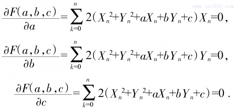 dn2- R2=(X - A)2+(Ya - B)2- R2=X n2+Y 2+aXn +bYn +c .  (4)