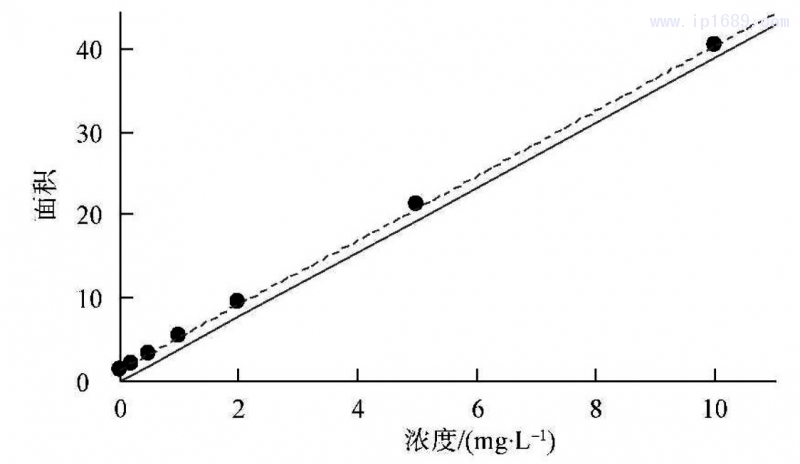 采用T0C、IC標準儲備液100mg/L,將其配制為0、0.2、0.5、1.0、2.0、5.0、10.0mg/L的標準溶液,測相應的峰面積。