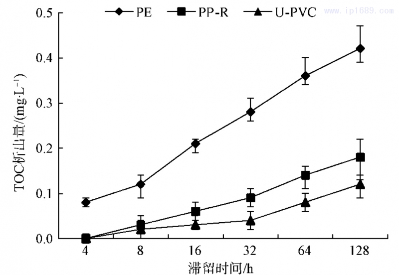 圖5為3種管材PE、PP-R、U-PVC樣品在浸泡時間分別為4、8、16、32、64、128h條件下,避光浸泡后,T0C的析出情況變化。
