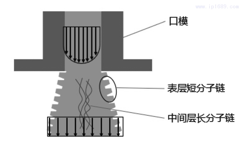 通過觀察擠線外觀變化的現象,結合高分子鏈 的黏彈性特征,認為各組分在經歷剪切場時,長分 子鏈會發生解纏、斷鏈等微觀變化。剪切力不同, 長分子鏈的鏈斷程度不一樣,剪切能力強,分子鏈 解纏或斷裂多。當熔體經過口模過程中,短鏈分子 鏈集中在口模壁一側,長鏈分子鏈集中在中間層。 不同長度的分子鏈黏彈性不一樣,短鏈回彈大,當 其離開口模后,表層的短鏈分子鏈回彈大,中間層 的長鏈分子回彈小,從而引起竹節缺陷[9-13],詳見圖 5竹節缺陷產生示意圖。