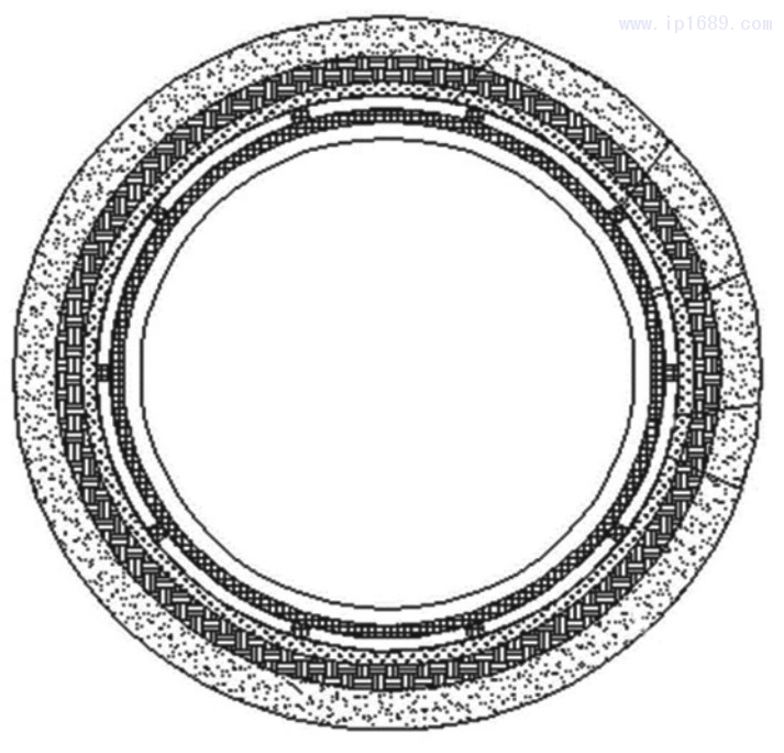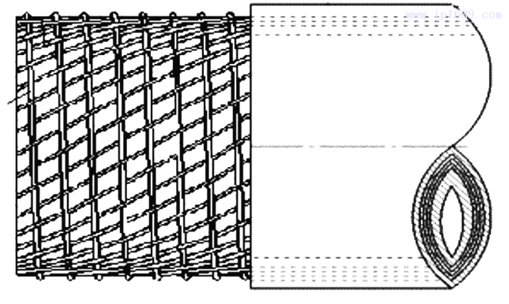 設(shè)置在內(nèi)層管材與外層管材之間,緯線與經(jīng)線的交叉點(diǎn)之間通過熱熔膠粘接或通過焊絲焊接。本實(shí)用新型采用經(jīng)緯編織的方法在內(nèi)層管材的外表面編織一個(gè)網(wǎng)