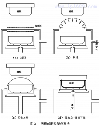 該法的成型方式與凸模吹泡真空成型法類似,同樣經過加熱,吹泡,模具上升,抽真空等階段。但是,模具采用凹模,并且在抽真空時, 模具上方加以輔模作為輔助手段,幫助成型更復雜的形狀。