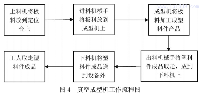 其組成主要有:上料機,進料機械手,成型機,出料機械手,下料機。它的成型工藝如圖 4 所示。