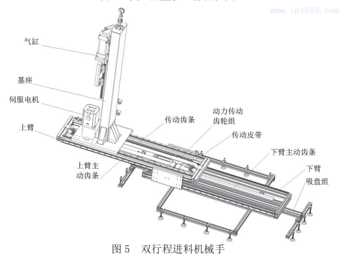 進料機械手的作用是板料送入成型機中。該機械手采用獨特的雙行程結構(圖5),一個動力驅動兩個行程。其特點是結構緊湊,不需要太多的空間。