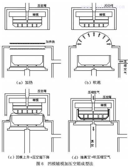 成型機采用凹模輔模加壓空箱的成型方式。成型方式與凹模輔模成型相類似,但是多了壓空箱的作用。在板料被加熱吹泡后,凹模上升的同時,壓空箱帶著輔模同時下降。在開始抽真空的那一刻,壓空箱將板料上方的空間密封住,形成一個密閉的空間。抽真空的同時,壓空箱內同時充入壓縮空氣。輔模輔助成型的同時,在一些輔模不易到達,或者有產品有倒扣的地方,壓縮空氣起到輔模的作用,幫助產品成型(圖 6)。