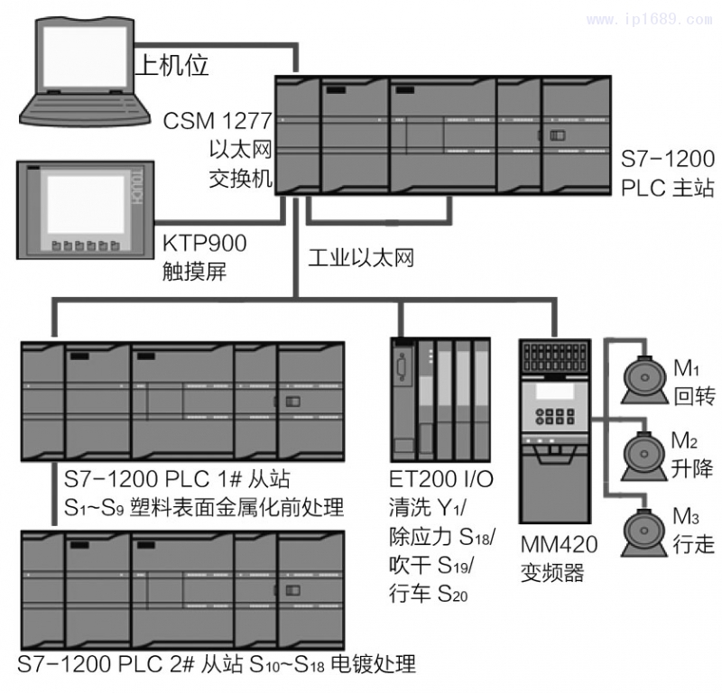 主站S7-1200PLC通過2臺以太網交換機CSM1277與上位機、KTP900觸摸屏、S7-1200PLC#1和#2從站、分布式I/O單元ET-200SP、行車控制變頻器MM420等設備建立工業控制網絡,接受上位機或觸摸屏對各控制位電鍍工藝參數的在線設置,通過主站S7-1200PLC調度從站PLC、分布式I/O和變頻器等機電設備,從而滿足不同ABS塑料制件的電鍍生產和工藝條件需求。