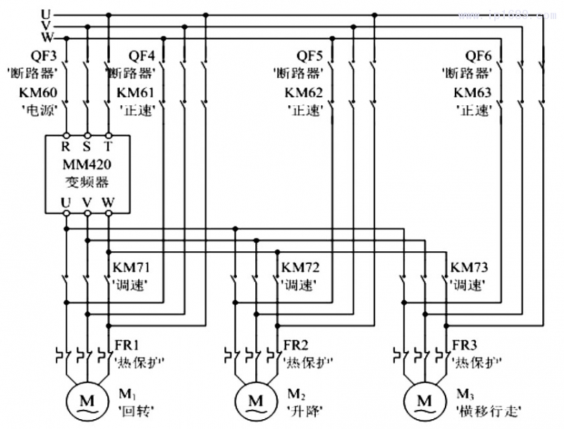 為避免掛具或工件掉落,在各工位槽間高效、平穩轉移ABS塑料制件,電鍍行車M1回轉、M2升降和M3橫移行走采用一臺MM420變頻器進行控制,如圖5所示。
