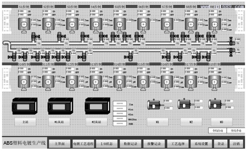 控制位S1~S20、Y1分別對應于ABS塑料電鍍生產線不同的工藝環節:首先根據I/O數量以及工位槽對加液、槽內工件位置檢測、溫度、pH和陰極電流密度等不同控制要求,將S1~S20、Y1各工藝環節分屬于不同的PLC分布式I/O從站,再通過高性能的以太網通訊將控制信號上傳到PLC主站和上位機,然后根據ABS塑料制件的形狀規格、牌號和用途,設置各控制位的工藝參數,再由PLC主站執行,實現ABS塑料電鍍生產線的自動化控制。