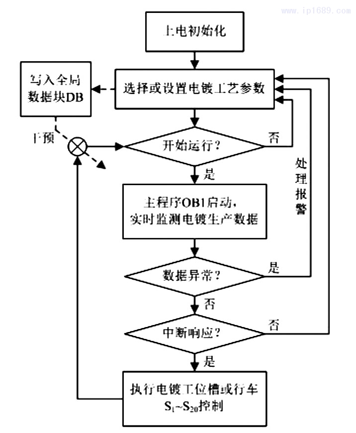 系統上電后,工藝人員通過上位機(或觸摸屏)操作面板設置或選擇電鍍工藝參數。由于WinCC在開發操作面板時已經將電鍍線控制軟件的內部變量與操作面板變量相關聯,設置或選擇的工藝參數將自動寫入梯形圖程序的全局數據塊DB1。選擇運行后,主程序OB1啟動將調用電鍍線S1~S20、Y1等控制位子程序,實時采樣、顯示和處理電鍍線生產數據。為確保OB1內對子程序的調用滿足不同工藝條件和電鍍流程需求,根據設置的電鍍時間等參數,中斷程序按工藝流程循環控制子程序的調用順序,在線響應DB1數據塊中設置的工藝參數。