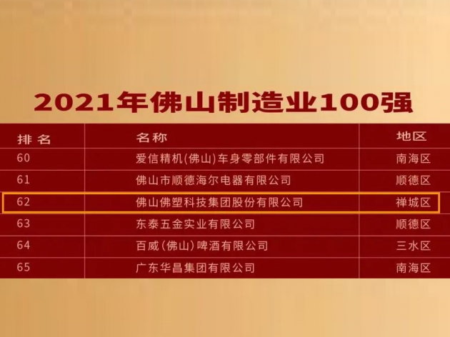 近日,由佛山市企業聯合會、佛山市企業家協會主辦的2021年佛山市企業家活動日暨佛山企業100強、制造業100強企業發布會舉行。會上首次發布了“2021年佛山市企業制造業100強”榜單,佛塑科技憑借超強實力成功入選,...