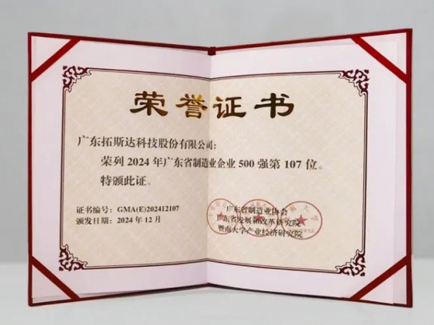 拓斯達獲評廣東制造業500強企業,這是拓斯達第四年榮登榜單。
