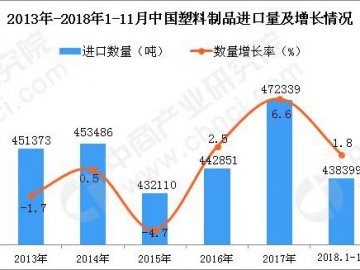 據(jù)中商產(chǎn)業(yè)研究院數(shù)據(jù)庫(kù)顯示,2015-2017年中國(guó)塑料制品進(jìn)口量明顯增長(zhǎng),共增長(zhǎng)40229噸,漲幅9.31%;2017年中國(guó)塑料制品進(jìn)口量為472339噸,同比增長(zhǎng)6.6%。2018年1-11月中國(guó)塑料制品進(jìn)口量為438399噸,同比增長(zhǎng)1.8%...