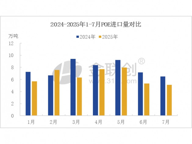 據(jù)海關(guān)數(shù)據(jù)統(tǒng)計(jì),2025年7月,其他初級形狀的乙烯-a烯烴共聚物進(jìn)口總數(shù)在5.1萬噸,同比減少21.7%,環(huán)比減少4.22%,2025年1-7月進(jìn)口總量45.68萬噸,同比減少16.4%。