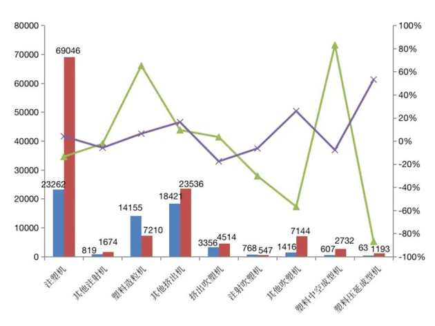 1~3月,擠出機進口數量、金額分別為754臺、1.6億美元,同比分別增長146%、-0.5%