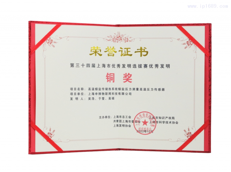 近日,上海申獅物聯網科技有限公司(以下簡稱“齊亞斯”)研發的高溫熔鹽傳儲熱系統、熔鹽壓力測量高溫壓力傳感器日前獲得第三十四屆上海市優秀發明選拔賽優秀發明銅獎。
