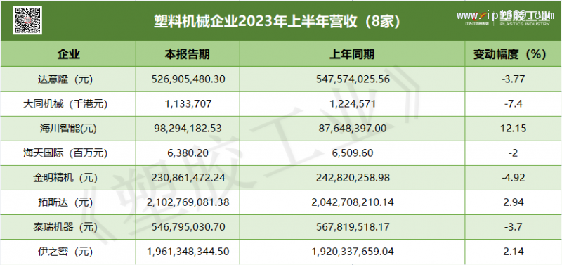 8家上市塑料機械企業營收數據中,只有海川智能、拓斯達和伊之密3家呈現上漲趨勢。