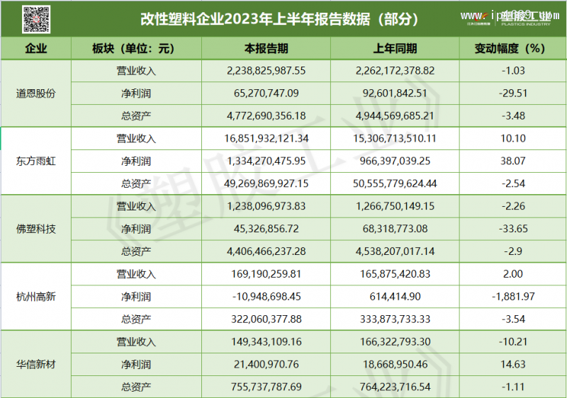 值得一提的是,改性塑料企業2023年上半年財報營收和總資產兩大板塊中,東方雨虹均超過百億元:營收約168.52億、總資產約492.7億;金發科技更是直超200億元:營收約203.49億,總資產約581.09億。