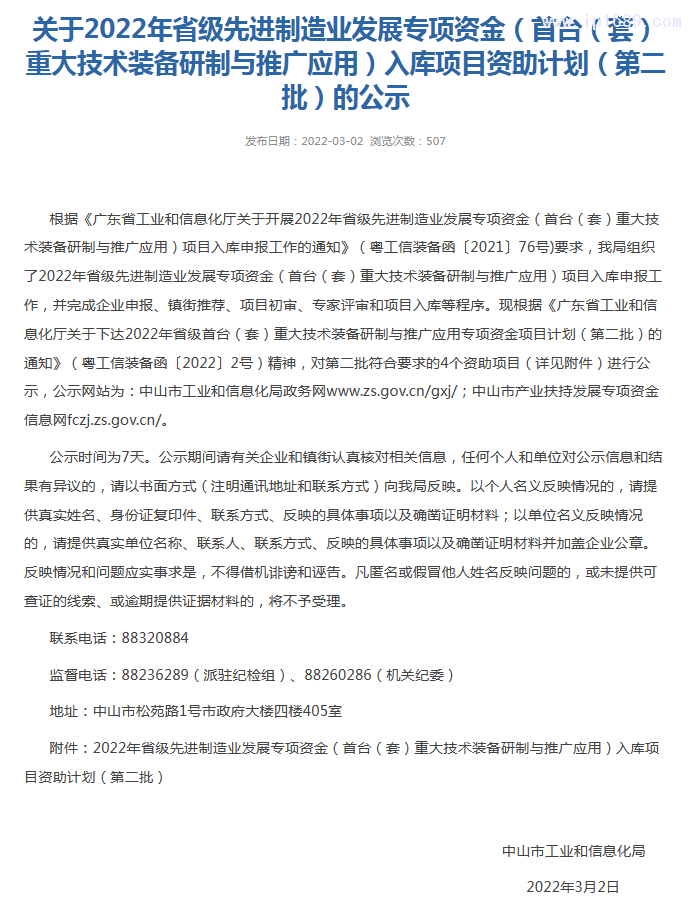 廣東省高新技術產品2項,分別獲得中山市重大裝備首臺套項目和廣東省重大裝備首臺套項目,并且獲得專項資金支持(下圖為廣東省首臺套項目公示)
