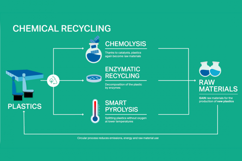 科思創的回收技術聚焦于機械回收、化學回收、從源頭進行回收設計。科思創尤其看重尚在起步階段的化學回收的潛力,其非常適用于無法機械回收或成本高昂的塑料。化學回收方面,科思創正在開發化學分解、酶分解、智能熱解三種類型的化學回收方法: