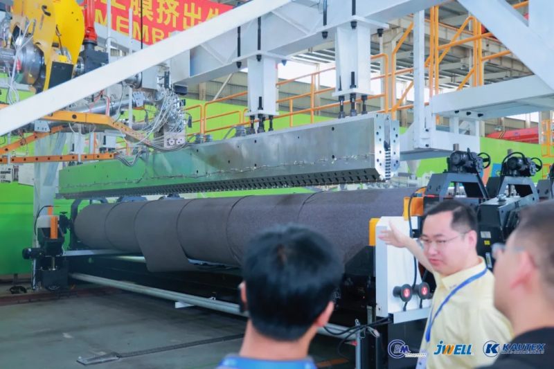 現場,創新材料的應用成果更是打開了行業未來發展的想象空間。技術員微笑著指向身旁的HDPE8000寬幅土工膜擠出生產線:“這是兩項生產線產品屬于國內首創,工藝技術、設備性能、產品質量等方面均達到了國際先進水平。”