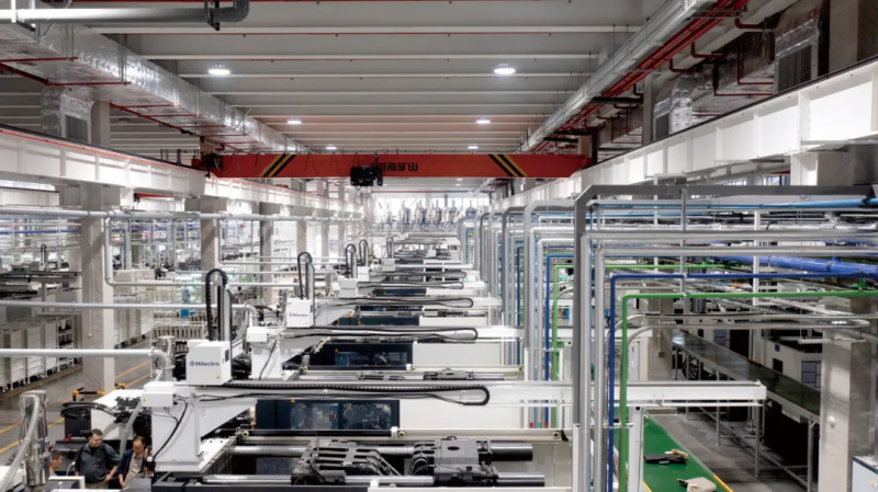 在智能產品領域,海天智聯以注塑機為核心,配套提供模溫機、干燥機等輔助成型設備,以及機械手自動取件系統和磁性模板快速換模裝置,形成完整的智能裝備體系。此外,公司不僅能為不同注塑產品定制單元級和產線級自動化方案,還自主研發產線控制器提升數據采集與處理能力。同時,提供了從集中供料、供水到智能倉儲的全套解決方案,并配套MES、WMS等信息化系統。
