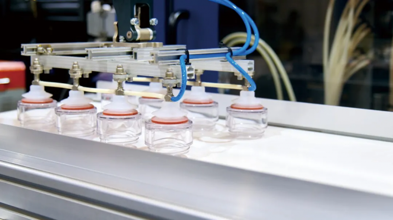 更值得關注的是飲用水托盤生產線的智能化改造案例。該項目不僅突破性地實現兩種型號托盤的共線生產,更將注塑成型后的取件、輸送、插管、冷卻、碼垛等工序全面自動化,最終達成生產效率翻倍、人工成本減半的顯著效益。