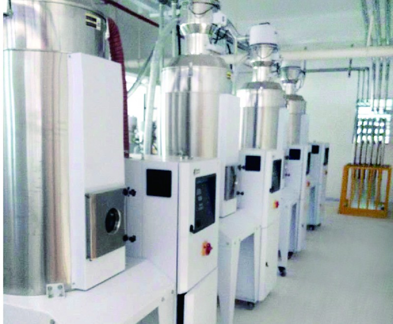湖北某汽車內飾有限公司專業從事開發、生產、銷售汽車內、外及發動機艙塑料零部件,包括:門護板、儀表板、保險杠、擾流板等。該公司共有含4臺雙色機在內的19臺注塑機,主要原料為ABS、PMMA,總用量約1950kg/hr,全部需要干燥,雙色機原料需要除濕,按客戶的需求我們為其配備了23臺干燥機設備。