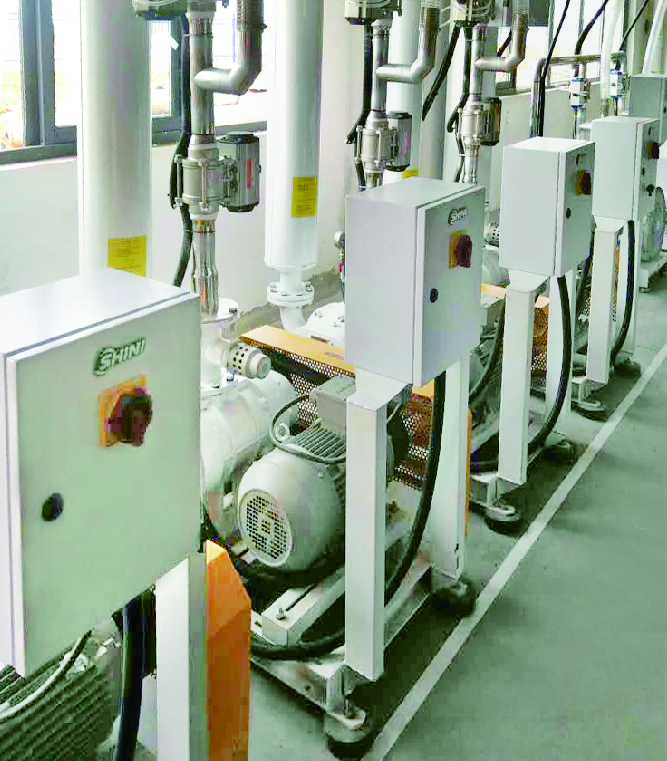 本系統用兩層平臺擺布,在平臺一層右側一字排開7臺風機,4臺魯式風機(三用一備)、三臺高壓風機(兩用一備),根據客戶的原料用量與車間情況,我們選擇了SRB-80-V與SCVG-75-SS,分別用于對車間注塑機上料與料房干燥機上料,并把干燥機分成兩組,12臺/組與11臺/組;而注塑機則分成三個區,分為4臺雙色機為一區,中段7臺注塑機為一區,前段8臺注塑機為一區。