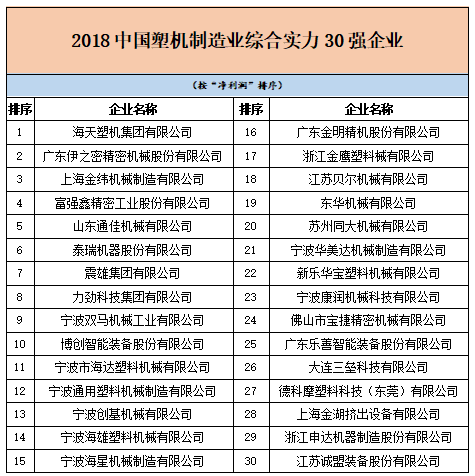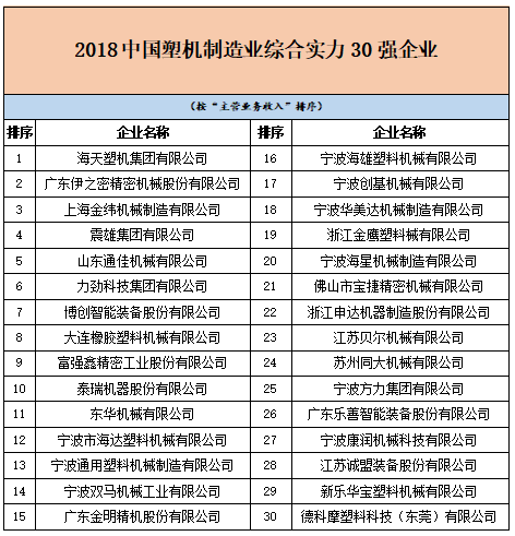 根據各單位上報的2017年度資料,經相關部門審查和核實,確定出“2018中國塑機制造業綜合實力30強企業”“2018中國塑料注射成型機行業15強企業”“2018中國塑料擠出成型機行業10強企業”“2018中國塑料中空成型機行業3強企業”和“2018中國塑機輔機及配套件行業5強企業”入選名單。