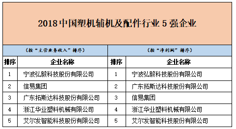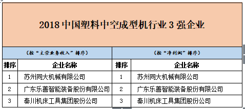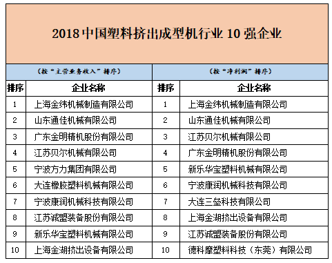 “2018中國塑料擠出成型機行業10強企業”的第一名是上海金緯機械制造有限公司;而“2018中國塑料中空成型機行業3強企業”的榜首由蘇州同大機械有限公司摘取;“2018中國塑機輔機及配件行業5強企業”則是由2017年未上榜的寧波弘毅科技股份有限公司摘得桂冠。