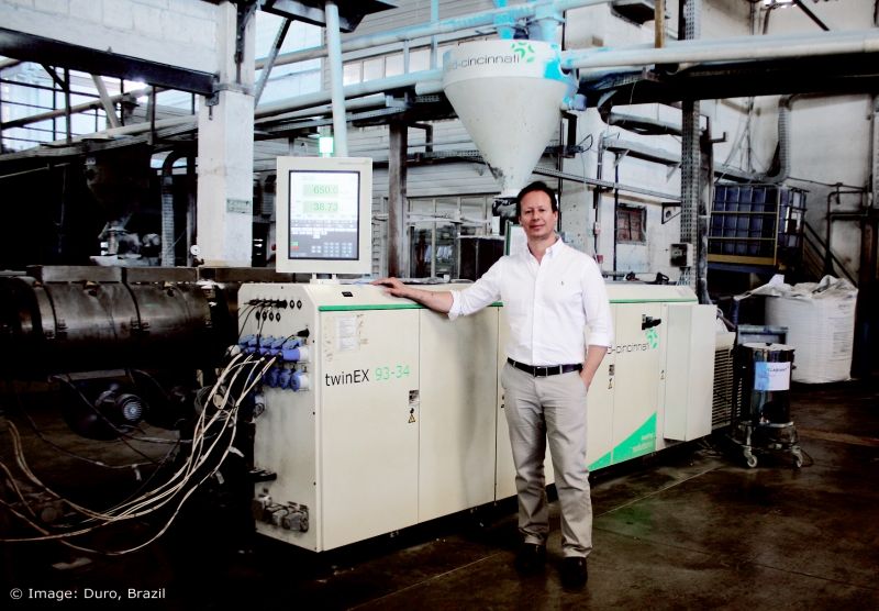 Duro負責人,Leonardo Brito Ferreira先生在生產車間與twinEX擠出機合影。(圖片來自 © Duro, Brazil)