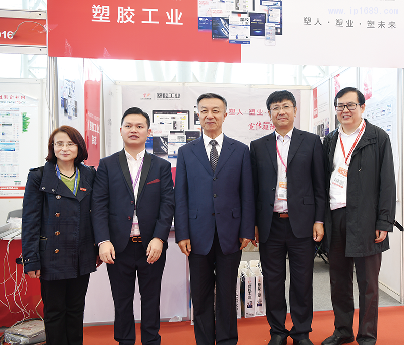 中國塑料加工工業協會理事長朱文瑋(中)副理事長馬占峰(右二)及領導在《塑膠工業》展位合影